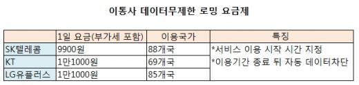 SK텔레콤의 무제한 데이터 로밍 요금제 가격은 하루 9900원(부가세 포함). 현지 시간을 기준으로 요금이 측정되기 때문에 시차 계산을 할 필요가 없고, 과금은 실제 데이터를 쓴 날에만 적용돼 사용하지 않은 날에는 요금을 부과하지 않는다. KT(69개국)와 LG유플러스(85개국)의 무제한 데이터 로밍 요금제 하루 이용료는 각각 1만1000원이다.