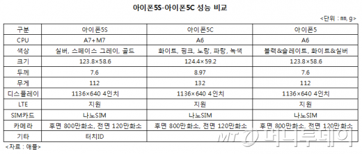 애플이 10일(현지시간) 미국 샌프란시스코 쿠퍼티노 본사에서 발표한 '아이폰5S'와 '아이폰5C'는 모두 '아이폰5'를 계승했지만 성능이나 재질, 색상 등이 다르다.