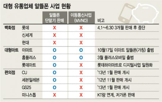 그러나 대규모 고객기반을 갖춘 대형마트들이 잇따라 시장에 합류하면서 대기업-대형 유통점 진영간 주도권 싸움이 본격화될 전망이다. 롯데 역시 기존 롯데마트 유통망과 하이마트 유통망을 통합 활용해 내년쯤 알뜰폰 사업에 진출하는 방안을 검토 중이다.