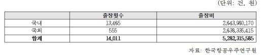 지난해 항우연(직원 733명)의 출장횟수는 총 1만4011건(국내 1만3465건, 국외 555건)에 이르며, 출장비로 쓴 비용은 총 52억8230만원(국내 26억4390만원, 국외 26억3830만원)으로 집계됐다.