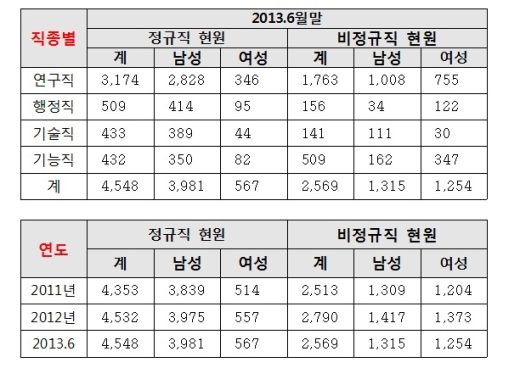 이렇게 정규직 인원이 증원하더라도, 여성 신규채용 비율은 낮기 때문에 여성 정규직 비율이 기초연 11.8%(2011년)→12.3%(2012년)→12.5%(2013년), 산기연 11.9%(2011년)→11.6%(2012년)→11.9%(2013년)으로 정규직 남녀 비율이 9대1로 고착화된 분위기라고 전병헌 의원실은 풀이했다.