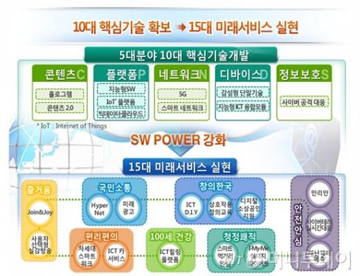 이를 위해 미래부는 콘텐츠(C), 플랫폼(P), 네트워크(N), 디바이스(D), 정보보호(S) 등 5개 분야에 10대 핵심기술을 개발, 신선장 동력으로 육성하고 글로벌 시장을 선점해나간다는 구상이다.