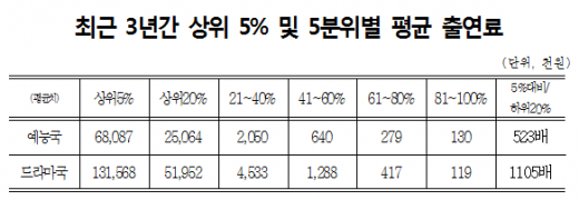 드라마 출연료의 빈부격차는 더욱 심하다. 상위 5%의 출연료는 평균 1억3157만원인 반면 하위 20%는 12만원에 불과했다. 상위 5%의 평균 출연료가 하위 20%의 1105배에 달하는 셈이다.