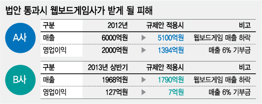 내년 1월부터 시행될 예정이라NHN엔터테인먼트(42,400원 0%),네오위즈(28,300원 ▲600 +2.17%)게임즈,CJ E&M넷마블 등은 매출 하락이 불가피해졌다. 웹보드게임 서비스업체들은 자체적으로 웹보드게임 매출 비중을 낮추고 있었지만 규제안이 발의되면 충격이 상당할 것으로 예상된다.