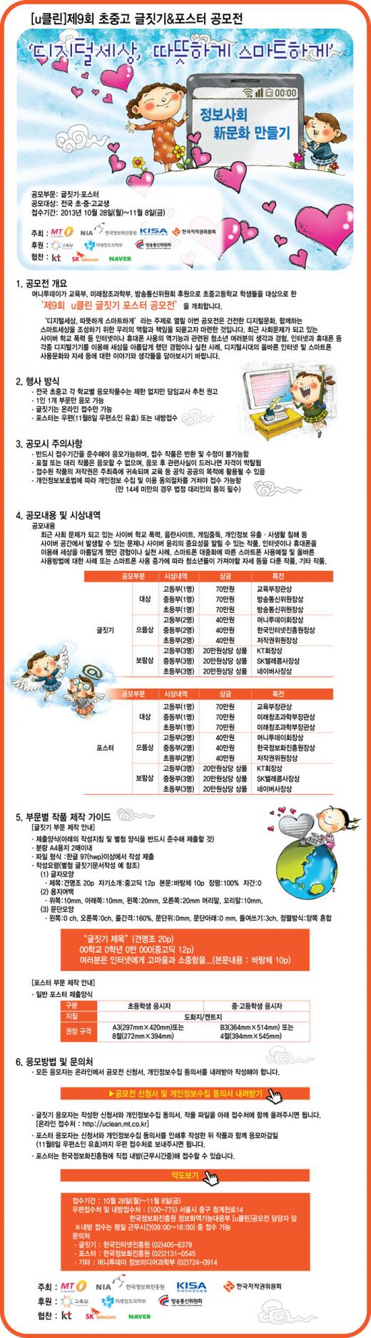 머니투데이와 한국정보화진흥원, 한국인터넷진흥원, 한국저작권위원회가 공동 주최하는 '제9회 [u클린]초·중·고 글짓기 & 포스터 공모전'이 28일부터 11월8일까지 작품을 접수합니다.
