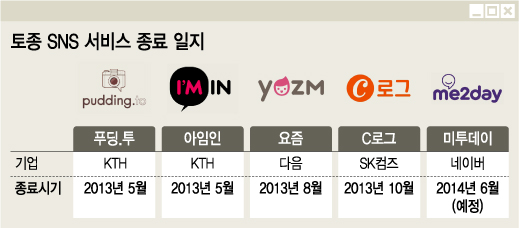 미투데이가 종료되면 국내 토종 SNS 가운데 서비스를 이어가는 곳은 사실상 '싸이월드 미니홈피'만 남는다. KTH의 '푸팅.투'와 '아임인'(5월),다음(48,050원 ▼350 -0.72%)커뮤니케이션의 '요즘'(8월), SK커뮤니케이션즈(SK컴즈)의 'C로그'(10월)가 모두 이용자 감소로 올해 서비스를 종료했다.