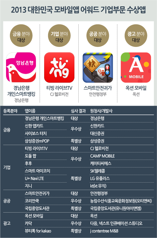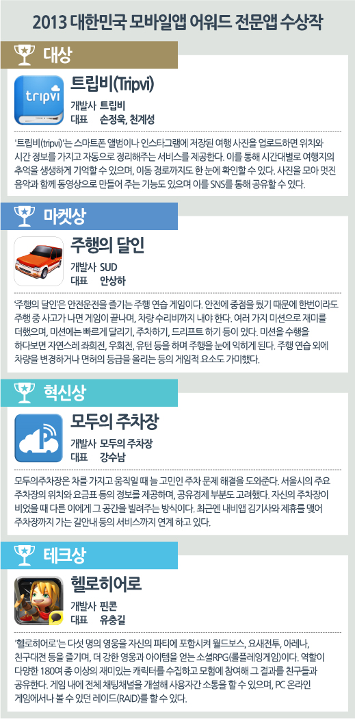 [2013대한민국모바일앱 어워드] 주행의달인·모두의주차장·헬로히어로 수상