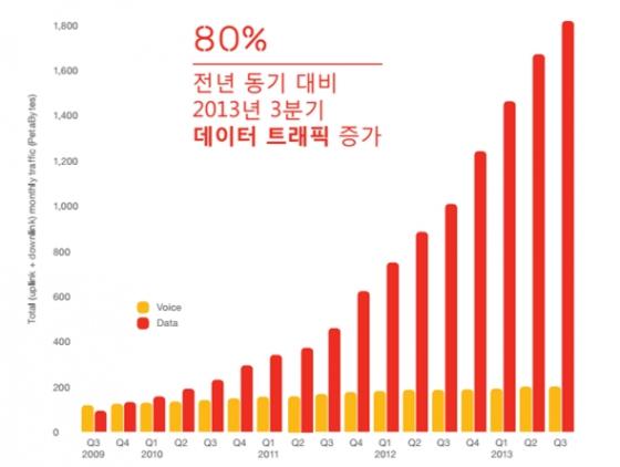 에릭슨-LG가 11일 발표한 '에릭슨 모빌리티 리포트'에 따르면 2013년 3분기 발생한 월별 모바일데이터 트래픽은 1.9exabyte(엑사바이트)로, 지난해 같은 기간보다 80% 증가했다. 모바일 기기에서의 데이터 트래픽은 연평균 45%의 성장률로 급격히 늘어날 것으로 보인다. 2019년에는 18.4엑사바이트까지 증가, 2013년의 10배 규모가 될 것이란 전망이다.