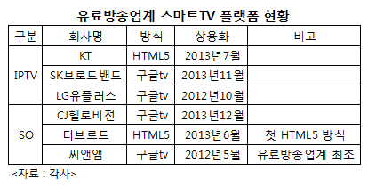 유료방송시장에서 본격적인 플랫폼 전쟁이 시작됐다.KT(57,400원 ▼3,300 -5.44%)계열과 티브로드는 HTML5를,SK브로드밴드-LG유플러스(15,170원 ▼650 -4.11%)-CJ헬로비전(2,230원 ▼75 -3.25%)-씨앤앰은 구글tv를 앞세우고 있다.
