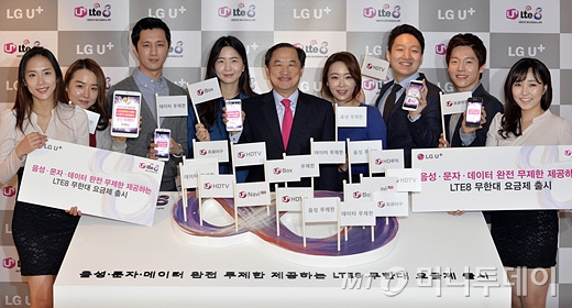 LG유플러스는 2일 소공동 웨스틴조선호텔에서 간담회를 갖고 월 8만원에 음성통화와 문자, 데이터를 무제한 제공하는 'LTE8 무한대 80'과 8만5000원에 음성, 데이터뿐 아니라 모바일TV, 프로야구 앱, 클라우드 서비스 등 부가서비스까지 쓸 수 있는 'LTE8 무한대85' 등 2종의 요금제를 출시한다고 밝혔다. 24개월 약정시 월 6만2000원이면 음성통화(유선, 영상전화 100분)는 물론 데이터까지 무제한 쓸 수 있다고 설명했다.