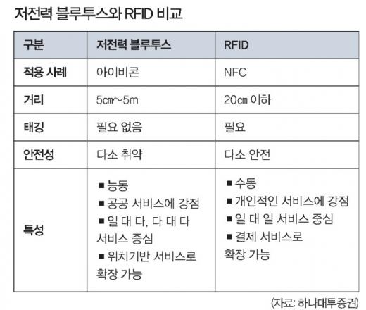 RFID, 저전력 블루투스 사용매직밴드에는 두 가지 근거리 통신 기술이 사용되고 있다. NFC에 사용되는 RFID와 아이비콘에 사용되는 저전력 블루투스다. 이 두 기술은 최근 들어 가장 주목받는 통신 기술이다. 모두 와이파이보다 짧은 거리에서 약한 전력으로 동작하기 때문에 사물인터넷(IoT) 구현을 위해 활용되고 있다. 하지만 세부 동작 방식과 용도에는 차이가 있다.