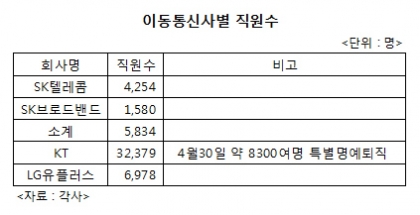 분기말 기준 SK텔레콤 인력은 4254여명. SK브로드밴드 1580명까지 포함하면 5800명 수준이다. 4월말 특별명예퇴직을 시행한 KT 2만4000명은 물론 LG유플러스 7000명보다 적다.