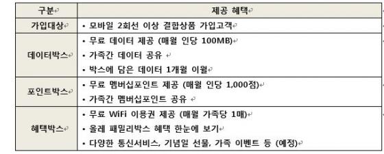 내달부터 출시되는 결합서비스 앱(App)인 '올레 패밀리박스'는 가족 간에 데이터와 멤버십 포인트를 자유롭게 공유할 수 있는 게 특징이다. 모바일 2회선 이상 결합 상품에 가입한 가족 구성원이 자신이 보유한 데이터와 포인트를 '박스'에 넣어두면 필요한 사람이 언제든 쓸 수 있다. 남은 데이터는 다음 달 말까지 자동 이월 된다.