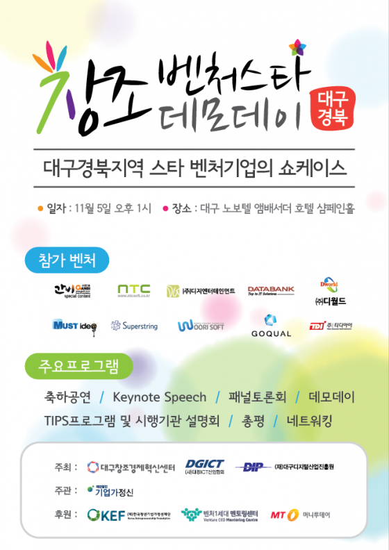 대구 경북 지역 최대 벤처기업 발굴·육성의 장인 '창조 벤처스타 데모데이-대구 경북'에 여러분의 많은 참관바랍니다.
