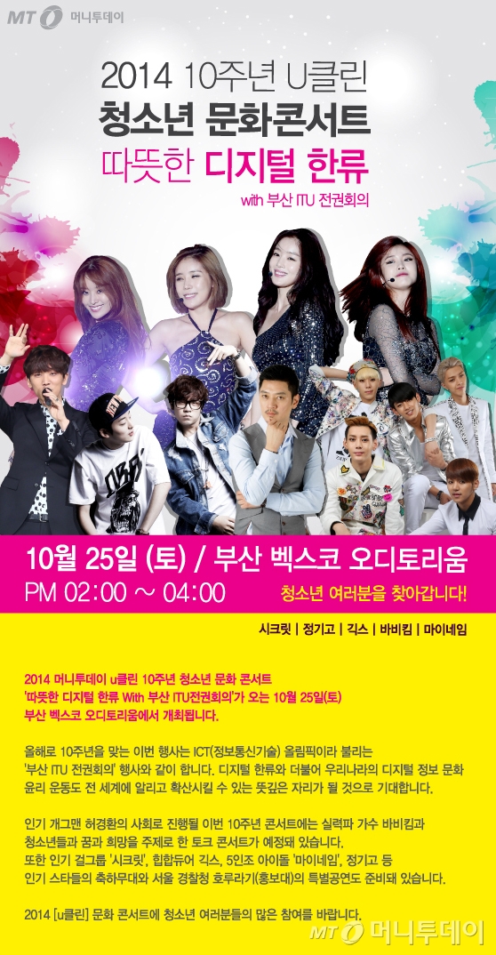 2014 부산 ITU전권행사의 꽃인 '10회 u클린 청소년 문화 콘서트'가 오는 25일 오후 2시 부산 벡스코 오디토리움에서 개최된다.