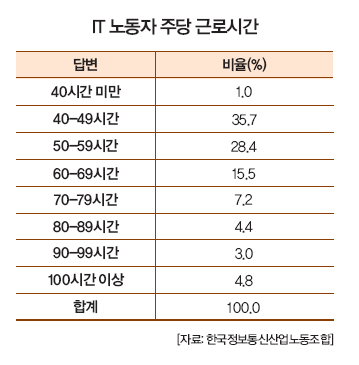 또 국회사무처 보고서에 인용된 한국정보통신산업노동조합 조사 결과를 보면, 국내 IT 근로자 중 주당 40시간 미만의 노동을 하는 비율은 1%에 불과했고, 50시간 이상 노동을 하는 비율이 63.3%에 달했으며, 70시간 이상 노동을 하는 사람도 19.4%에 이르렀다. 2013년 기준 IT노동자들의 주당 평균 근로시간은 57.3시간으로, 2004년 평균 근로시간(57.8시간)과 비슷한 수준을 유지했다. 또 초과근로시간에 대해 정확히 계산해 지급받는 개발자는 10.3%에 그쳤고, 전혀 지급받지 못한다는 응답자가 76.4%에 이르렀다.