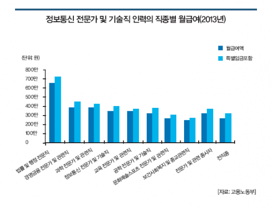 이는 전체 직종의 임금 수준을 100으로 할 때 약 132수준으로, 전문가 및 관련 종사자 직군 내에서는 법률 및 행정 전문직, 경영·금융 전문가 및 관련직, 과학 전문가 및 관련직 다음의 수준이다. 반면 미국 컴퓨터 관련 인력의 임금수준을 보면, 컴퓨터 및 정보시스템 관리자의 연봉이 13만 2570달러, 시스템SW 개발자가 10만 4480달러, 응용 SW 개발자가 9만 6260달러, 컴퓨터 프로그래머가 8만 930달러, 데이터베이스 관리자가 8만 740달러, 정보보안 분석가가 9만 1210달러 등으로 우리나라에 비해 2~3배 높다.