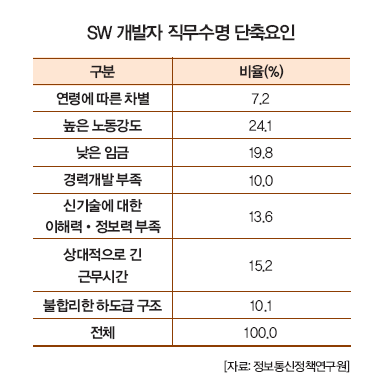 정보통신정책연구원이 지난해 말 502명의 SW 전문가를 대상으로 조사한 결과를 보면, 전체적으로 주로 높은 노동강도(24.1%)와 낮은 임금(18.9%)으로 인해 SW 개발자들의 직무수명이 단축되고 있다고 응답했으며, 긴 근무시간(15.2%)에 대한 문제도 큰 것으로 나타났다. 특히 응용 패키지 SW 기술자와 디자인·코딩 인력이 상대적으로 긴 근무시간을 직무수명 단축의 가장 큰 요인으로 지목한 비율이 높았다.