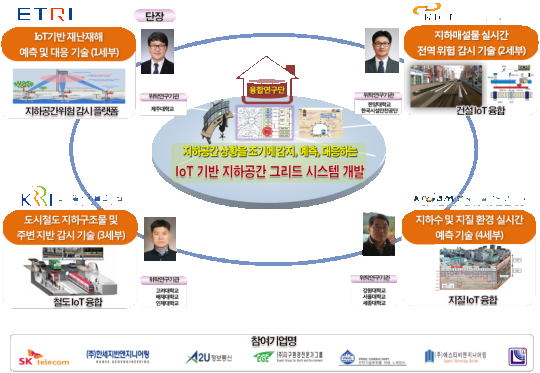 4개 출연연은 각각 보유한 기술력을 동원해 △지하공간의 지질환경 △지하수 분포 및 변화 △도시철도 구조물 및 주변 지반 변화 △주변 상하수도 관로 상태 변화 등의 복합 감시 데이터를 분석해 지하공간의 이상 징후를 사전에 감지·예측·대응하는 'IoT 기반 지하공간 그리드 시스템'을 개발하는 것을 목표로 하고 있다.
