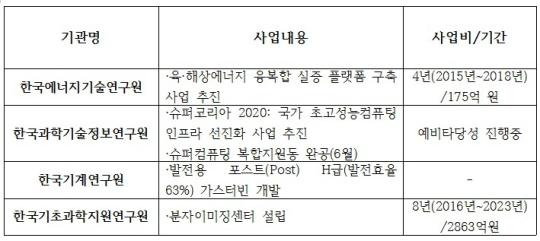 육·해상에너지 실증플랫폼, 차세대 슈퍼컴퓨팅, 분자이미징센터, 가스터빈 개발 등