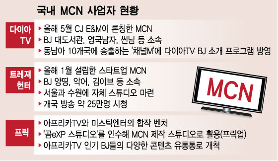 신병휘 아프리카TV 상무는 "MCN은 유튜브 등 해외에서는 2008~2009년부터 시작됐지만 국내에서는 지난해 하반기부터 급격히 성장했다"며 "현재 100만명 이상 구독자를 보유하고 있는 BJ 대부분은 아프리카TV에서 2000년대 중반부터 기반을 쌓아오다가 새로운 플랫폼으로 나아간 것"이라고 말했다.