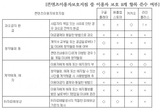 모니터링 결과 '과오금 환불', '청약 철회' 등 이용자 보호와 직결된 9개 항목의 준수율은 구글 플레이 44.4%, 애플 앱스토어 11%, 카카오 25%, 라인플러스 11%에 그쳤다.