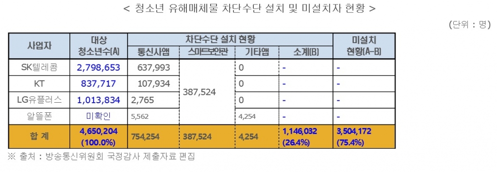 지난 7월 말 기준 이동통신가입 청소년은 스마트폰이용자 398만명과 피처폰이용자 66만2000명 등 총 465만명이다. 유해매체물 차단수단 설치 비율은 26.4%에 불과하고 나머지는 처음부터 차단 수단을 설치하지 않았거나 삭제한 것으로 조사됐다.