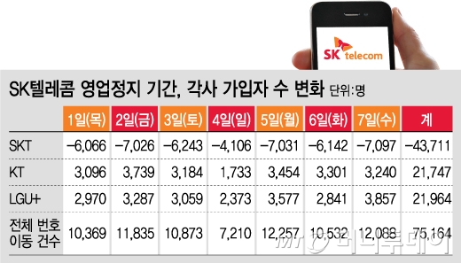 8일 방송통신위원회와SK텔레콤(80,900원 ▲3,100 +3.98%)등에 따르면 지난 1일부터 7일까지 이어진 영업정지 기간 SK텔레콤의 가입자 수는 총 4만3711명 줄어든 것으로 집계됐다. 하루 평균 6244명의 가입자가 빠져나간 것으로, SK텔레콤이 선방했다고 평가하는 분위기다. 하루 평균 번호이동건수도 7506건으로 예상보다 과열된 분위기는 아니었다.