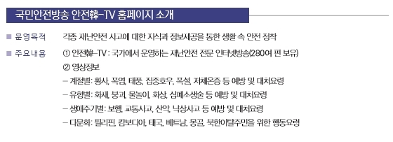 재난 예방 및 대처 방안을 알리는 국민안전방송을 각종 IT 기기에서 시청할 수 있고, 빅데이터 기반의 한파, 폭염 안전사고 예보가 주간 단위로 이뤄진다.
