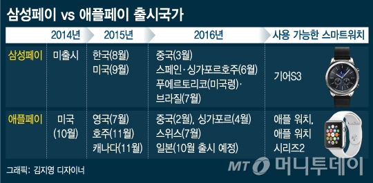 ◇‘기어S3’, ‘삼성페이’ 지원…일본선 ‘애플 워치2’가 교통카드 역할도=삼성전자가 출시할 기어S3는 삼성 웨어러블 기기 최초로 ‘삼성페이’를 지원한다. NFC(근거리무선통신)뿐 아니라 마그네틱보안전송(MST) 방식까지 지원한다. 사용자들은 오프라인 매장에서 카드결제 단말기에 손목을 대는 것만으로도 손쉽게 결제할 수 있게 된다. 시계의 우측 상단부 버튼을 길게 누르면 삼성페이를 이용할 수 있는 화면으로 전환되고, 갤럭시 스마트폰에 입력된 결제카드를 선택, 결제 기기에 가까이 되면 수초내 바로 결제된다.