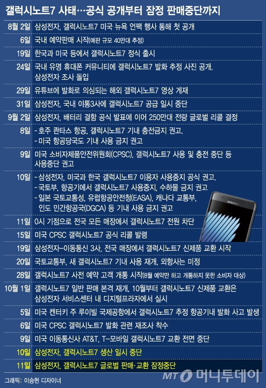 삼성전자는 11일 갤럭시노트7 판매를 잠정 중단한다고 발표했다. 최근 국내외에서 새로운 기기의 발화 사고가 잇따르자 소비자 안전을 위해 정식 조사결과가 나오기 전까지 판매를 중단하기로 한 것.