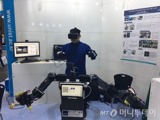 지난 16일 경기도 일산 킨텍스 제1전시장에서 열린 ‘대한민국 안전산업박람회’에서 배준범 울산과학기술원(UNIST) 기계·원자력공학부 교수 연구팀이 개발한 ‘원격 조종 재난 대응 로봇’, 이른바 ‘아바타 로봇’을 직접 체험해 봤다. 재난 대응 로봇이란 일본 후쿠시마 원전 사고와 같은 대형 재난 발생 시, 사람 대신 재난 현장에 투입하는 로봇을 말한다. 이 로봇 연구의 핵심은 효율적으로 작업을 진행할 수 있는 직관적인 로봇 제어 인터페이스에 있다.