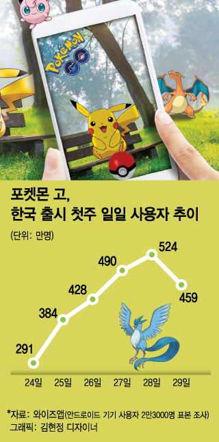 30일 앱 분석업체 와이즈앱에 따르면 포켓몬 고는 출시 첫 주(23~29일) 698만명이 게임을 즐긴 것으로 나타났다. 지난 24일 출시 당일 291만명을 시작으로 384만명(25일), 428만명(26일), 490만명(27일), 524만명(28일) 등으로 일일 사용자가 꾸준히 늘었다. 29일 사용자는 459만명으로 다소 떨어졌다. 게임 설치자는 758만명에 달한다.