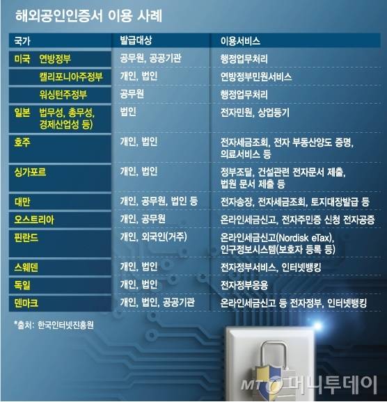 미국, 유럽, 일본, 중국 등도 공적 분야는 정부가 주도적으로 전자서명제도를 운영하고 있으며 유엔 본부와 산하 기관에서도 PKI 도입을 추진하고 있다. 유럽연합(EU)은 2016년 7월부터 전자서명 관련법을 도입해 공공, 금융분야에서 공인인증서를 사용하기 시작했다. 뱅크오브스코틀랜드는 공인인증서 사용을 의무화하고 있다. 에스토니아는 세무, 상업 등기 등 공공분야와 인터넷뱅킹 등 민간분야에서 공인인증서를 사용을 늘려가고 있다. 일본은 2015년부터 공공서비스와 금융결제 등에 공인인증서(JPKI) 사용을 본격화하고 있다. 중국에서는 2016년 11월 기준 3억 5000만장의 공인인증서가 발급됐고 지난해 7월부터는 알리페이와 같은 비은행계 지급수단에 대해 일정 규모 이상의 금액을 이체할 경우 반드시 공인인증서를 사용해야 한다.