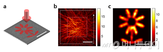 플라즈몬 신호로 전달된 2차원 이미지 복원 실험. 그림 a와 같이 꽃무늬 이미지를 빛으로 만들어 무작위로 배열된 나노 안테나에 보낸다. 그림 b와 같이 마치 노이즈처럼 산란된 플라즈몬 신호를 흰색 실선을 따라 반시계 방향으로 측정하였다. 미리 측정된 전달 행렬을 이용하여 그림 c와 같은 꽃무늬 이미지를 복원하였다. 이는 각각의 나노 안테나에 도달하는 광신호를 플라즈몬 신호로 정확히 전달할 수 있음을 보여주는 결과이다/자료=IBS