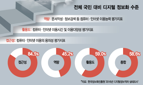 ◇소외계층 정보 역량, 일반국민의 절반도 안돼=한국정보화진흥원(NIA)이 공개한 ‘2016 디지털정보격차 실태조사’에 따르면 장애인·저소득층·농어민·장노년층 등 4대 소외계층의 디지털 정보화 수준은 전체 국민의 58.6% 수준에 머물렀다. 2015년 52.4% 대비 다소 호전된 결과지만 디지털 정보의 홍수 속에서 ‘외딴 섬’에 고립된 사람들은 여전히 많다.