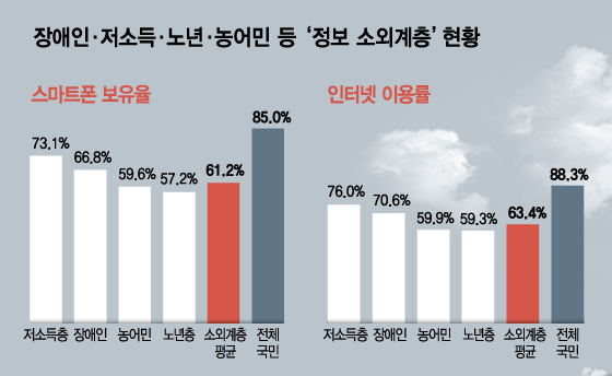 특히 소외계층 가운데 스마트폰을 보유한 비율은 61.2%에 그쳤다. 영아를 포함한 전체 국민 가운데 85.0%가 스마트폰을 보유하고 있는 것을 고려하면 격차가 상당한 수준이다.