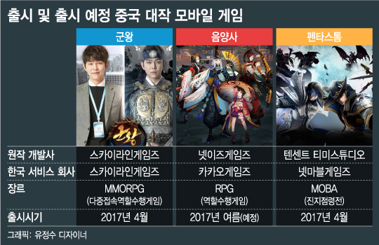 ◇달라진 中 게임, 韓서 ‘돌풍’=넷마블게임즈의 ‘펜타스톰 for Kakao’를 시작으로 올 여름 카카오게임즈의 ‘음양사’, 스카이라인게임즈의 ‘군왕’ 등 상반기 내 다수의 중국 히트 게임 대작들이 국내 시장에 연이어 출시된다.