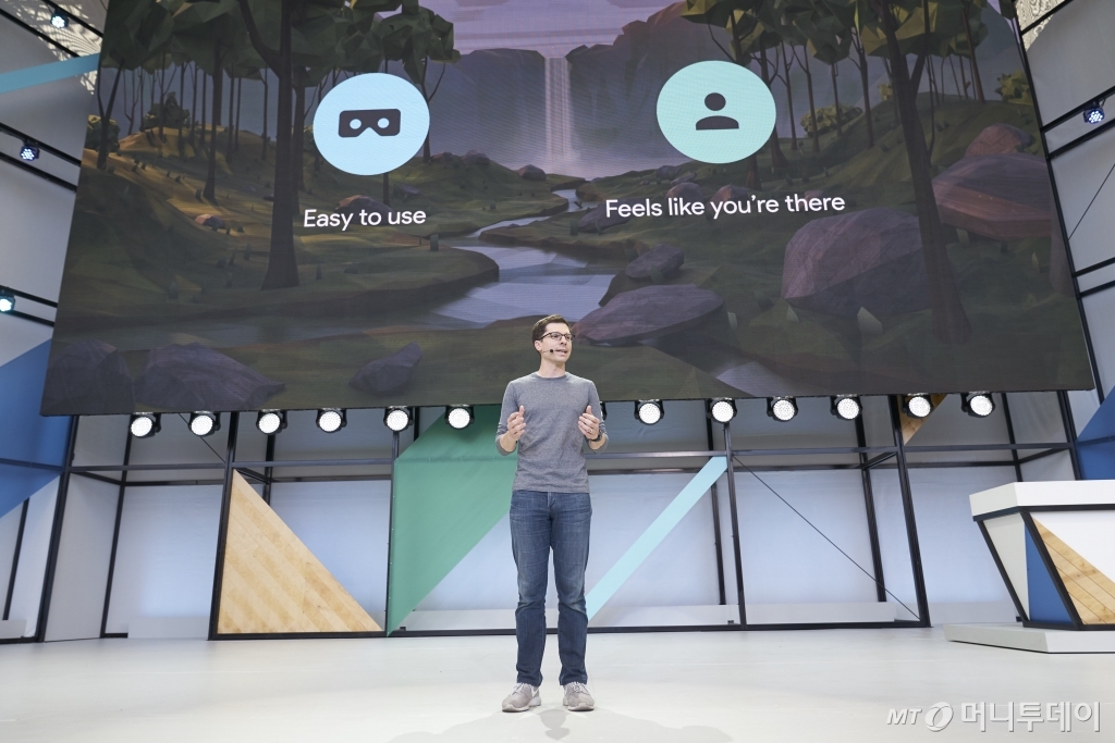 18일(현지시간) 미국 캘리포니아주 마운틴뷰 쇼어라인 엠피시어터에서 개최된 ‘구글 연례개발자대회(I/0) 2017’ 둘째날 기조 연설. 무대에 오른 클레이 베이버 구글VR 담당 부사장은 차세대 VR 헤드셋 기기 개발 상황을 소개하며 이같이 말했다.