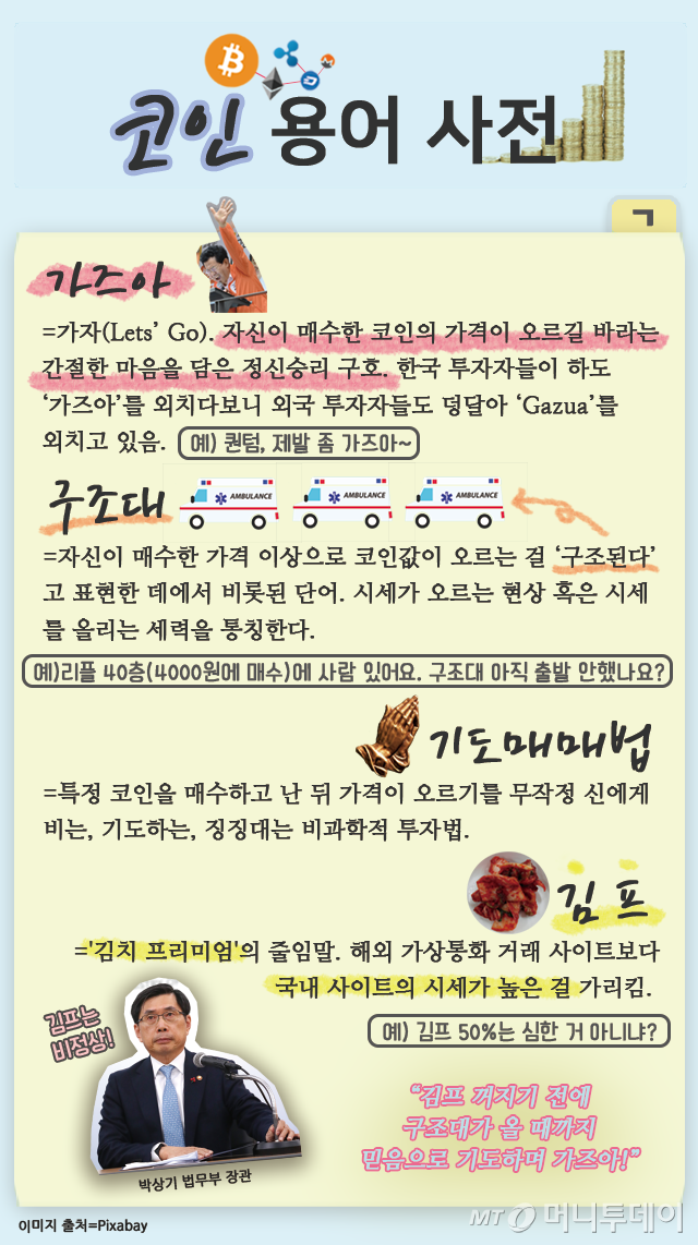 코인 투자자들이 시세가 오르길 기도하며 주구장창 '가즈아'를 외치다보니 각종 '가즈아' 짤이 등장했고, 이제는 TV 예능프로그램과 광고에서도 심심찮게 보고 들을 수 있는 유행어가 됐다. 오지고 지리는 '급식체'에 이어 '요즘 대세' 바통을 이어받은 이 '코인 용어'들은 대체 무슨 뜻일까? 어떻게 쓰일까? 주요 용어들의 의미와 예문을 정리해봤다. 일명 '알고보면 쓸데있는 잡다한 코인 용어 사전'!