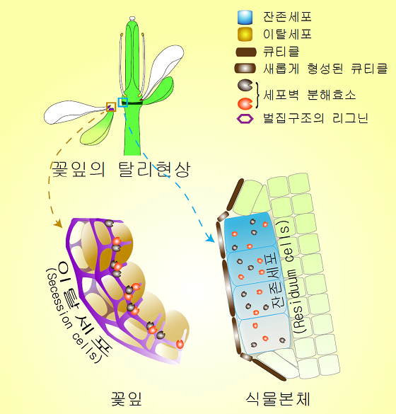 연구진은 잔존세포와 이탈세포가 서로 다른 특성을 지니며, 식물의 본체와 꽃잎의 정확한 탈리를 위해 역할을 분담하고 서로 협업한다는 사실도 밝혔다. 또 세포 사이를 분리시키는 세포벽 분해효소가 꽃잎이 탈리되는 경계선에만 밀집되도록 하여 주변 세포들로 퍼지지 않도록 조절하는 역할을 한다는 점도 규명했다.