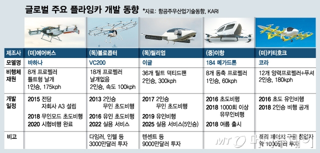 다임러와 인텔이 3000만 달러를 투자한 독일 볼로콥터는 2인용 자율운항 플라잉 택시를 개발, 두바이 시 외곽에서 시험 운행 중이다. 40분 충전에 30분 가량 비행할 수 있다. 두바이시(市)는 2022년 플라잉 택시 서비스를 상용화할 예정이다. 또다른 독일 스타트업 릴리엄도 시속 180마일로 운항할 수 있는 수직이착륙기(eVTOL)을 개발, 내년 유럽 지역에서 시험 운행한다는 목표다. 중국 ‘큰손’ 텐센트가 투자했다. 래리 페이지 구글 창업자가 투자한 키티호크도 뉴질랜드에서 ‘코라’라는 에어택시 사업을 추진하고 있다.