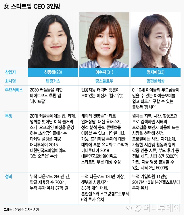 창업의 꿈에 도전한 스타트업(초기 벤처기업) 여성 대표 3인(정지예 맘편한세상 대표, 신동해 텐핑거스 대표, 이수지 띵스플로우 대표)을 만나 창업에 관한 다양한 얘기를 들어봤다. 이들 대표는 한목소리로 말한다. “여성이라 불리할 것도 유리할 것도 없다. 창업의 본질에 집중해라.”