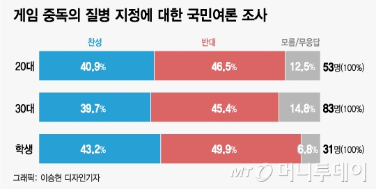 ['질병' 기로 선 게임]⑥성별·세대별 의견차…질병규정 女·40대이상 찬성, 男·30대이하 반대 우세