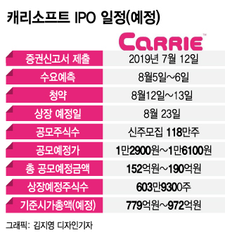 캐리소프트는 6일까지 수요예측을 진행하고 12~13일 양일간 청약을 진행한 후 이달 23일 상장할 예정이다. 공모 주 수는 118만주이며 공모 예정가는 주당 1만2900~1만6100원이다. 공모 예정금액은 152억~190억원이다.