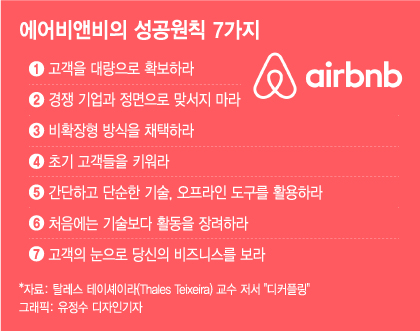 에어비앤비는 카우치서핑 등 이미 다른 단기 임대서비스가 있었음에도 맨 주먹에서 천 명, 백만 명까지 사용자층을 키워나갔다. 테이셰이라 교수가 정리한 에어비앤비의 성공원칙 7가지는 다음과 같다.