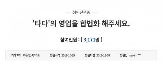 ◇'타다 합법화' 청원 나선 이용자들… "소비자 존중하라"= 30일 청와대 국민청원게시판에 따르면 지난 28일부터 시작된 '타다 영업 합법화' 청원에 동의한 인원이 3100명을 돌파했다.