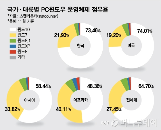 한국인터넷진흥원(KISA)과 스탯카운터 등에 따르면 여전히 국내에서 윈도우7 운영체제를 사용하는 PC는 500만대가 넘는다. 지난 11월 기준 국내 윈도우 사용자 중 윈도우7 점유율은 21.9%이다. 윈도우10(73.5%)에 이어 두 번째로 높다. 윈도우 PC 5대 중 1대가 윈도우7을 쓰는 셈이다.