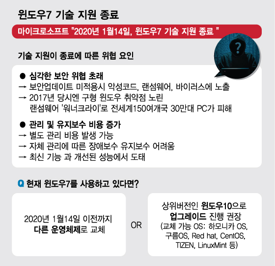 정부까지 나서 윈도우7 교체를 독려하고 있는 이유다. 과학기술정보통신부와 한국인터넷진흥원(KISA)은 MS의 윈도우7 기술 지원 종료에 대비해 비상대응 체계를 운영할 예정이다. 기술 지원 종료 이전까지 OS 교체 또는 윈도우 업그레이드의 필요성을 최대한 홍보하여 국민들의 자발적인 참여를 유도 중이다. 종료 이후에도 MS 및 백신 프로그램 제조사들과 손잡고 관련 악성코드 등장 여부를 모니터링하는 한편, 만약 사이버 공격이 발생할 경우 전용 백신을 개발해 보급한다는 계획이다. 다만 전용 백신은 OS 자체의 취약점을 해결하는 것이 아닌 만큼 현재로서는 OS 교체가 최선의 방법이다.