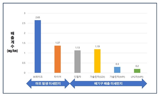이는 DPF(매연저감장치)가 장착돼 유로6 규제를 만족하는 디젤차와 GDI(직접분사식 가솔린) 엔진이 장착된 가솔린차에서 배출되는 미세먼지보다 2배 이상 높은 수치다.